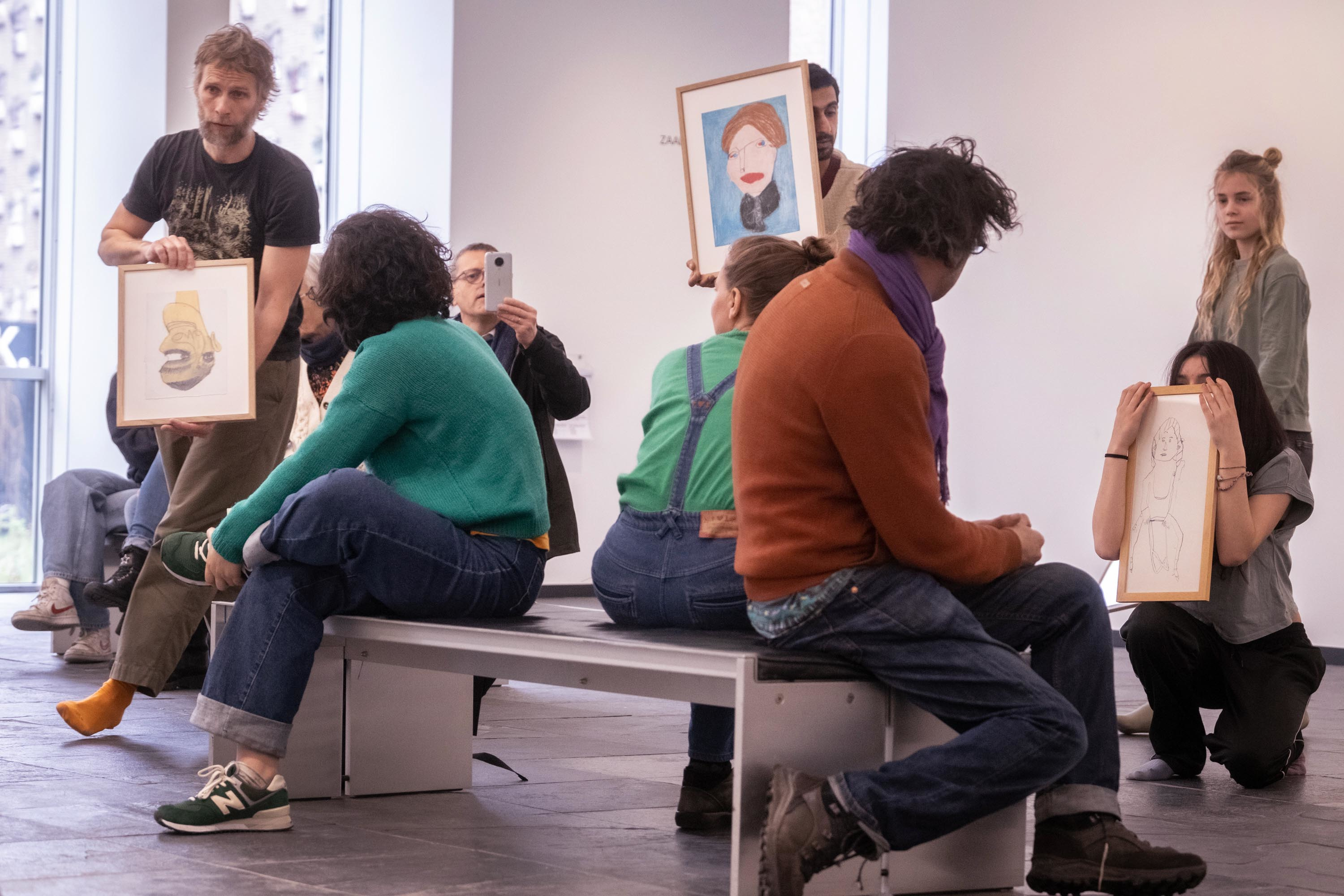 Rarely is the spectator so directly involved and his/her gaze so disarmingly appealed to. The strength of this performative exhibition is in the playfulness and open-mindedness with which the young performers approach the visual works. The works do not hang passively on the wall but are shared with the audience in an improvisation accompanied by live music.The collection, assembled by Pierre Muylle, consists of works made by artists with intellectual disabilities and created in studios in Europe.
